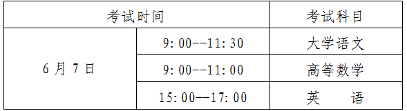 文化考试分文史和理工两大科类。文史类文化考试科目为大学语文、英语、专业课;理工类文化考试科目为高等数学、英语、专业课。各科分值均为150分,总分为450分。报考体育、艺术专业的考生可以任选文史类或理工类参加考试。