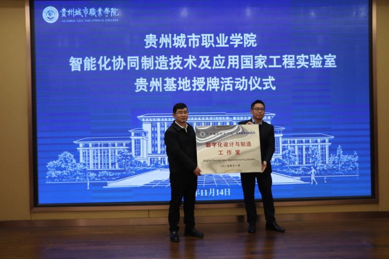 2025年11月14日上午,贵州城市职业学院在行政楼一楼文化交流厅隆重举行智能化协同制造技术及应用国家工程实验室贵州基地暨数字化设计与制造工作室授牌仪式。学校理事长周鸿静、校长徐高峰、副校长李剑锋等校领导,北京数码大方科技股份有限公司副总裁何伟、西南事业部总经理耿宇等企业领导共同出席仪式。机电学院、校企合作处、实习实训处等部门负责人及100余名学生代表参加活动。
