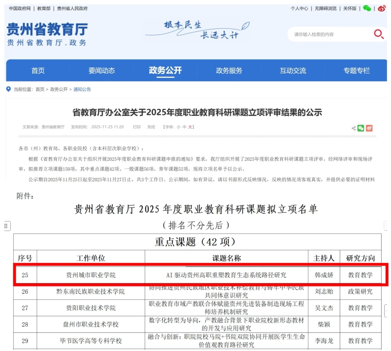 近日,省教育厅公布了《2025年度职业教育科研课题立项名单》,我校韩成娇副教授主持申报的《AI驱动贵州高职重塑教育生态系统路径研究》课题,在贵州省2025年度职业教育科研课题评审中脱颖而出,成功立项重点课题,充分彰显了我校在科研项目申报中的持续突破能力!