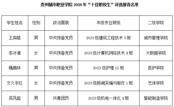 贵州城市职业学院2025年“十佳职校生”评选推荐结果公示