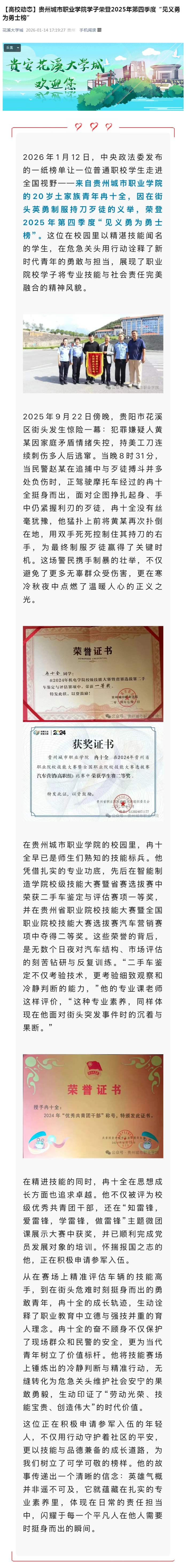 花溪大学城 | 【高校动态】贵州城市职业学院学子荣登2025年第四季度“见义勇为勇士榜”