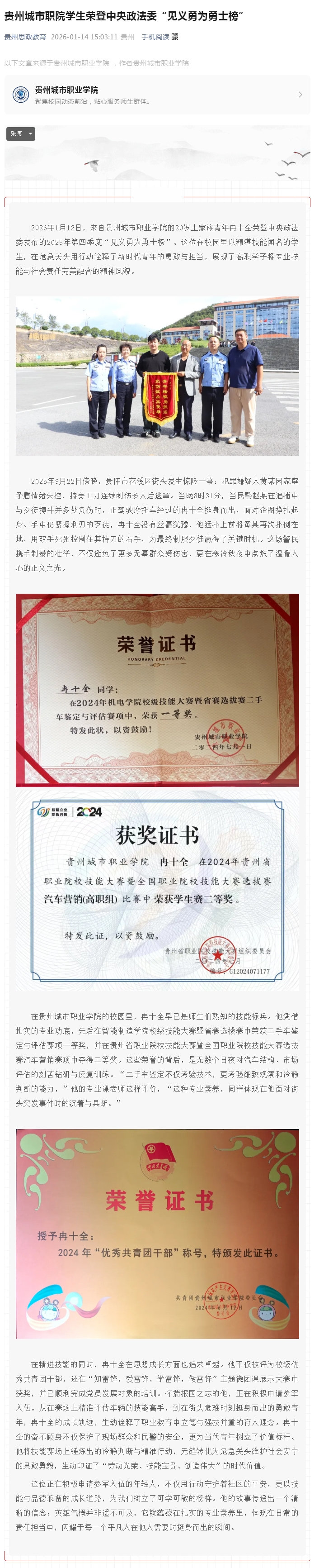 贵州思政教育 | 贵州城市职院学生荣登中央政法委“见义勇为勇士榜”