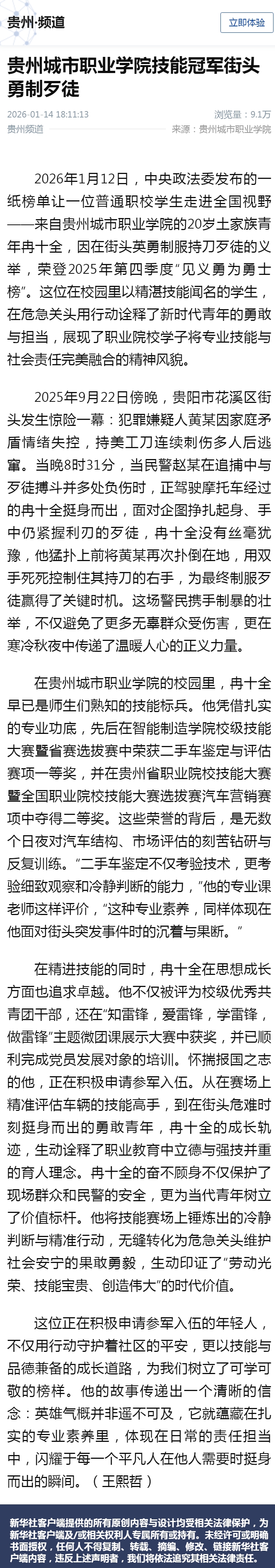 教育在线 | 从技能标兵到正义先锋——贵州城市职业学院学生冉十全以专业冷静制伏持刀凶徒