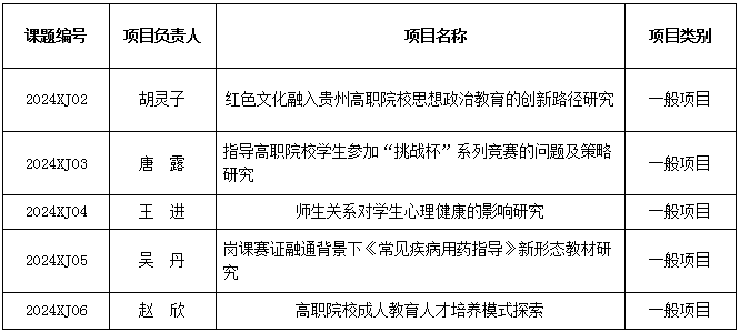 根据《贵州城市职业学院科研项目管理办法》文件要求,我校近期组织开展了2024年度校级课题结题验收工作,经过研究成果合规性检查及组织专家评审等环节,共有5项课题通过结题验收。现将结果予以公示,公示时间为2026年4月8日至4月10日,如有异议请以书面形式向科研处反映。