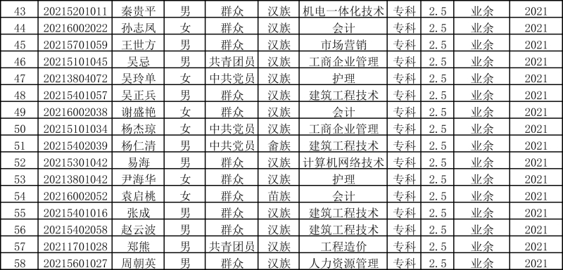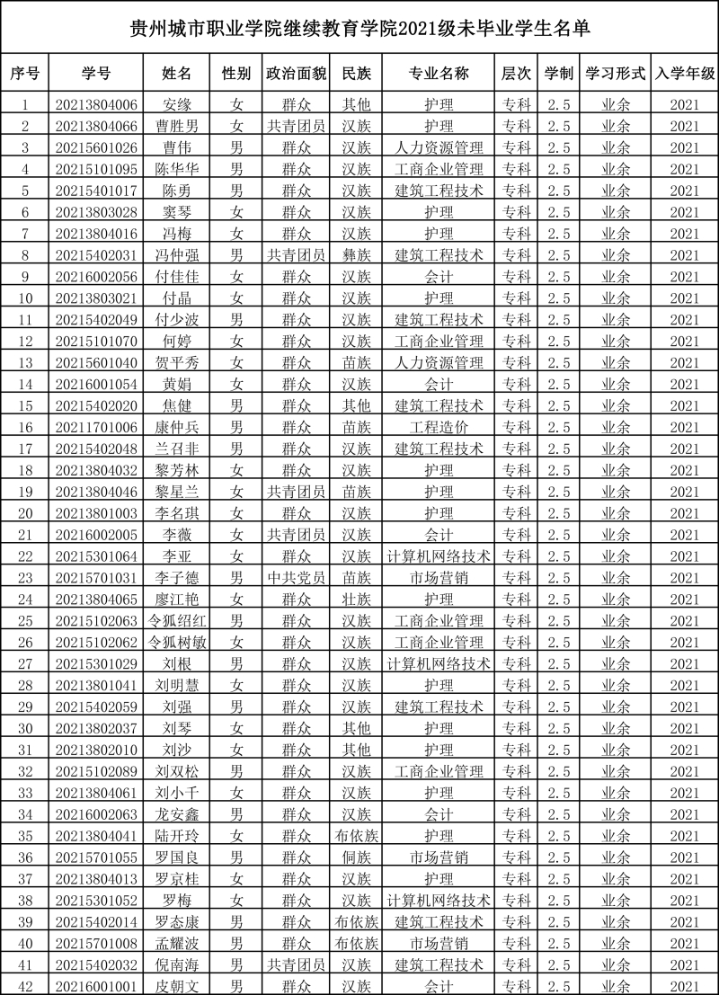 依据教育部《普通高等学校学生管理规定》(教育部令第41号)及《贵州城市职业学院成人高等教育学生学籍管理规定》相关条款,学生在校学习时间(含休学)最长不得超过5年修业年限。经核查,继续教育学院2021级成人高等教育共有58名学生(含安缘、曹胜男等),在学校规定的最长修业年限内未能完成学业,未达到毕业要求。