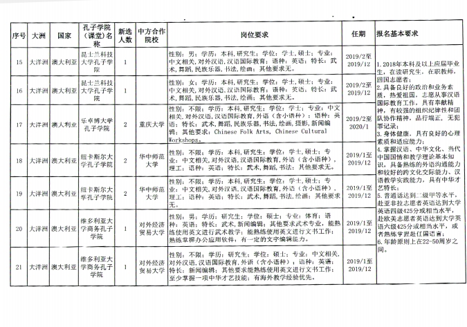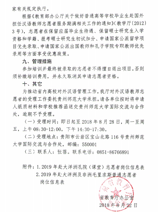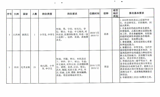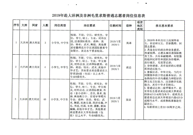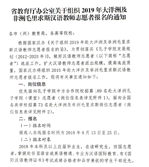 省教育厅办公室关于组织2019年大洋洲及非洲毛里求斯汉语教师志愿者报名的通知