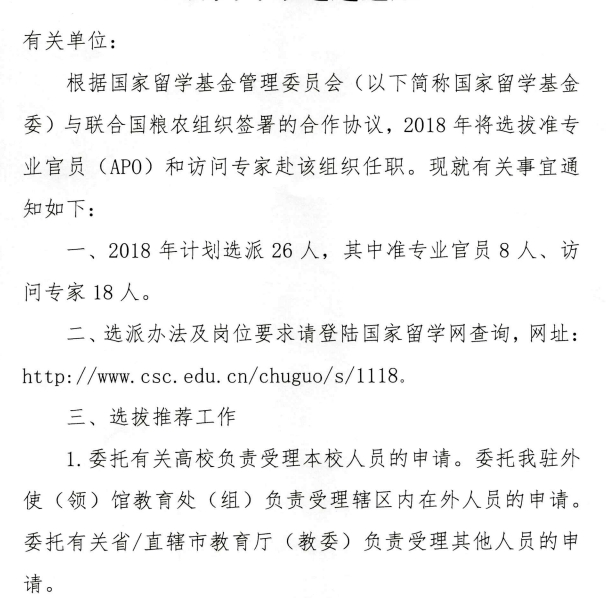 2018年联合国粮农组织准专业官员和访问专家遴选通知