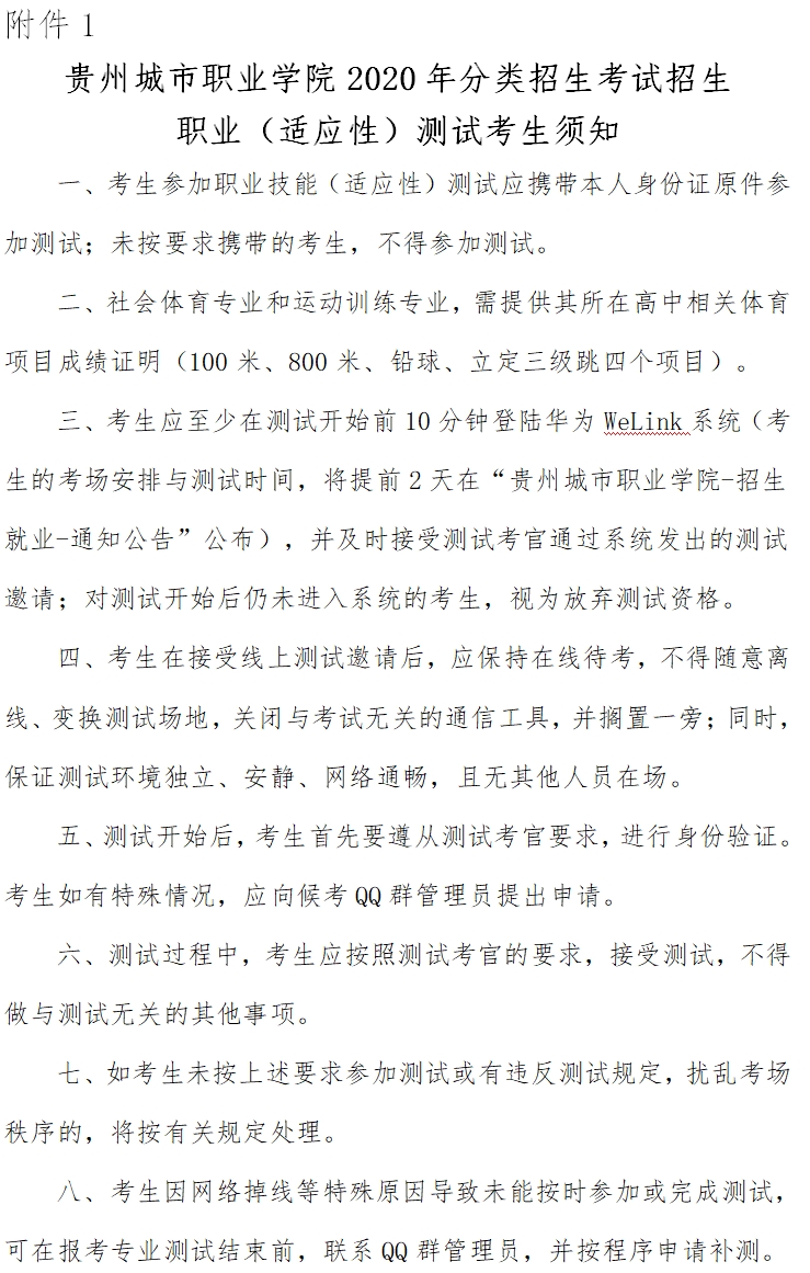 附件1. 贵州城市职业学院2020年分类招生考试招生职业(适应性)测试考生须知