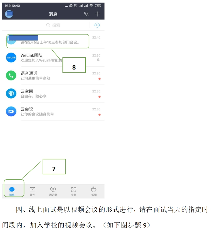 3.所有考生应在测试开始前十分钟(上午8点50分)登陆华为“Welink”APP,等待会议邀请。