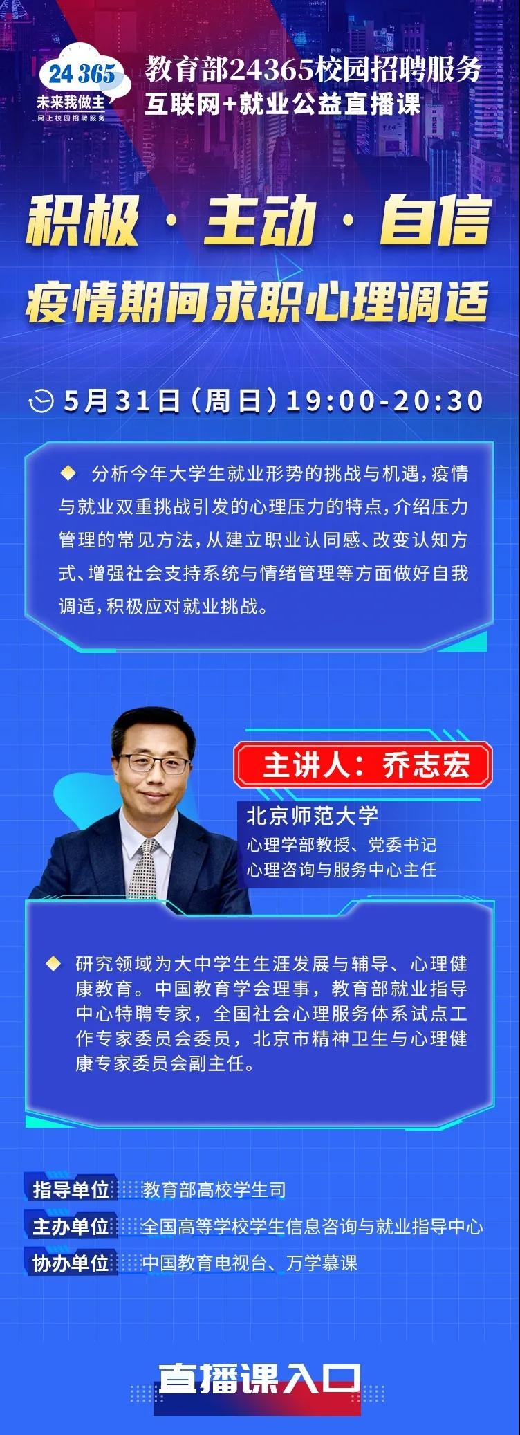 教育部学生司指导,全国高等学校学生信息咨询与就业指导中心主办教育部24365校园招聘服务“互联网+”就业——积极主动自信(疫情期间求职心理调适)公益直播课,于今天即5月31日(周日)/19:00—20:30开课,课后接着于20:30—21:30,举办第三期24365专家在线咨询答疑活动。开课网络连接仍然登录学习强国APP、新职业网等前几期直播网络。学校领导指示:学校通过网站和微信公众号进行广泛宣传,请各二级学院安排毕业班主任及时下载教育部公益直播课通知宣传图和学校通知,通过毕业班级QQ群、微信群等迅速转发传递传达给学校2020届全体毕业生,做好组织全体毕业生积极参加收看收听直播课学习的工作,要求:一、针对毕业班级,1、毕业班级通知截图;2、毕业生收看收听截图;3、毕业生写出心德体会。二、学校就业系统人员(含就业处全体、团委基层报名工作人员、保卫处应征入伍工作人员、招生处专升本工作人员等)和二级学院院长、书记和就业工作全体人员及毕业班主任都要收看收听今天的讲座,提升教师做好毕业生就业工作的技能,目的是努力做好疫情防控期间毕业生就业的心理和生理等工作,努力通过抓好6月份学校就业工作,教育和指导毕业生做好充足就业准备,提升就业技能,争取引导、促进和帮助更多学校毕业生实现就业创业,使毕业生平安毕业后顺利步入社会。