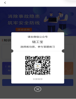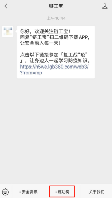 帮助员工学习、掌握更多安全知识,提高挑战答题的正确率。点击活动页面的“练功房”,关注“链工宝”微信公众号,在下方菜单栏选择“练功房”,可进行答题练习。