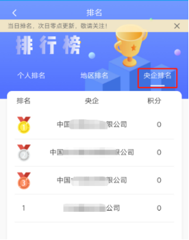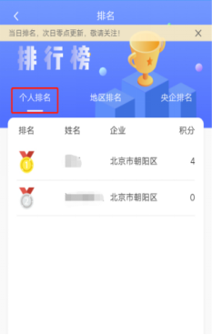挑战答题、抽奖活动均可获得不同积分。当日积分排名,次日零点更新。点击活动页面“竞赛排名”,可查看个人排名、地区排名、央企排名。
