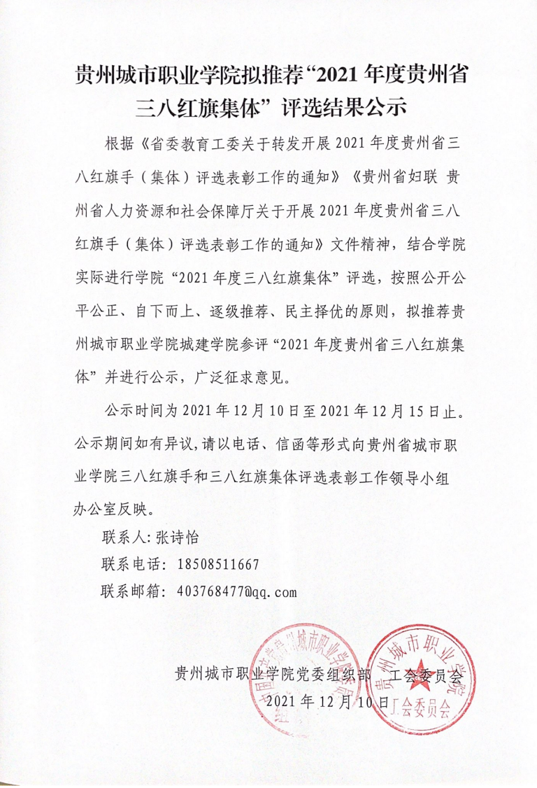贵州城市职业学院拟推荐“2021年度贵州省三八红旗集体”评选结果公示
