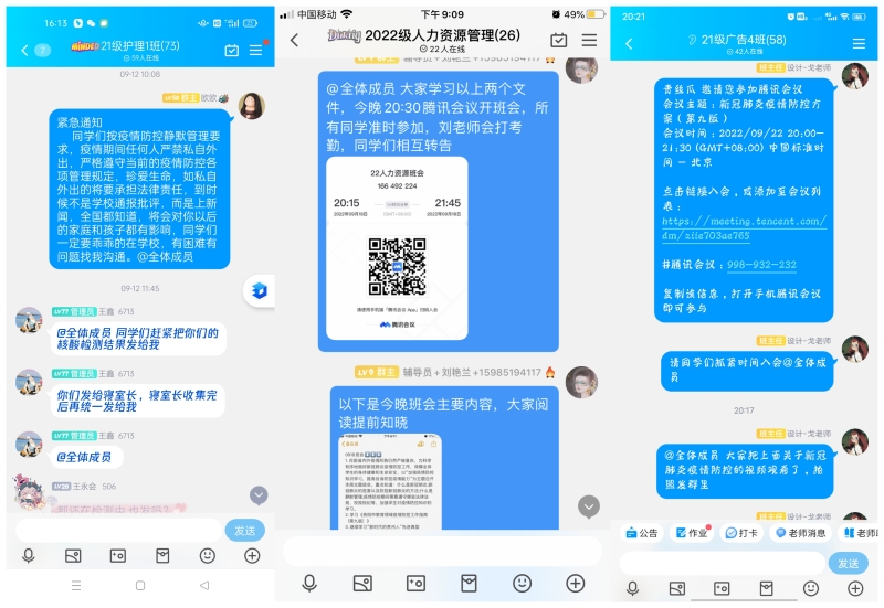 学校教师杨丽老师是中专部的一名辅导员。她能够非常敏锐地了解到疫情期间学生们的情绪变化和心理动态,进而进行有针对的帮助。她密切联系同学,很好地调动了班长、团支部书记等学生干部的积极性和主动性,充分发挥了班集体的凝聚与带动作用。经常给学生转发来疫情防控政策、知识、新闻报道、英雄事迹等,帮助学生始终保持积极向上,充满活力的良好心态。她那娇小的身躯在寝室与楼道之间穿梭不停,每天近100分钟的通话时间,回复上百条微信、QQ语音是工作常态。