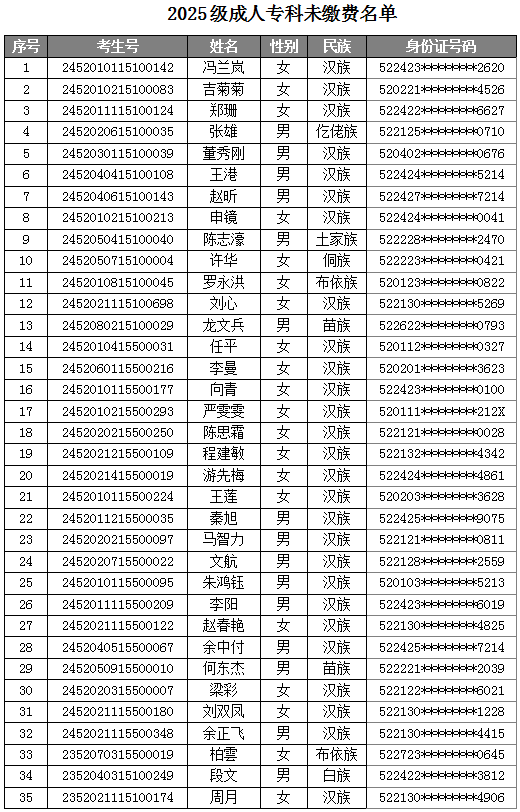 我校2025级成人专科新生学籍注册工作即将结束,截止目前仍有35位同学未缴纳学费,按照学校《贵州城市职业学院成人高等教育学生管理规定》文件要求:未按学校规定缴纳学费或其他不符合注册条件的,不予注册学籍。