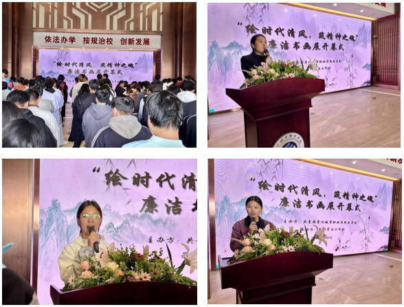 本次开幕式由校易班学生工作站站长唐心蕊同学主持。活动伊始,主持人向与会人员介绍了本次书画展的主题、目的及出席嘉宾。开幕式上,校团委书记汪倩发表了致辞。汪书记深刻阐述了举办此次廉洁书画展的重要意义,指出活动旨在通过书画艺术这一生动载体,传播廉洁理念,涵养校园清风,激励广大师生在艺术熏陶中汲取廉洁文化养分,夯实清正廉洁思想根基,共同营造崇尚廉洁、风清气正的校园文化氛围。