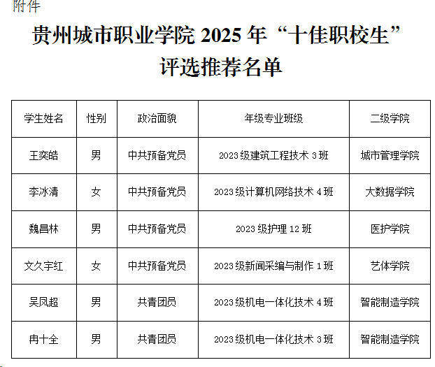 贵州城市职业学院2025年“十佳职校生”评选推荐结果公示