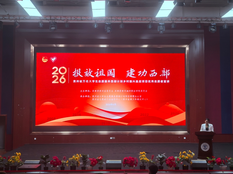 为扩大西部计划乡村振兴基层项目影响力,引导青年投身基层建功立业,4月12日,由共青团贵州省委员会、共青团贵州城市职业学院委员会主办,贵州省大学生志愿服务西部计划项目管理办公室承办的贵州城市职业学院2026年贵州省西部计划优秀志愿者事迹巡回宣讲会圆满举行。500余名城院青年学子及志愿者代表齐聚现场,共赴一场青春奋斗的盛宴。