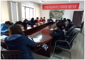 2017年4月17日中午,校团委老师在团委二楼会议室组织全体团干进行了学生干部能力素质培训,通过短暂而丰富的团干培训学习,让学生深刻地认识到,在这个终身学习的时代,必须要坚持学习,不断充实自己。在培训中团干们体验到了青春的激情与力量,认识到一个人的无限潜力,更认识到新时期团工作的新方法和新理念,坚定了大家工作的信心。