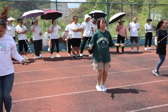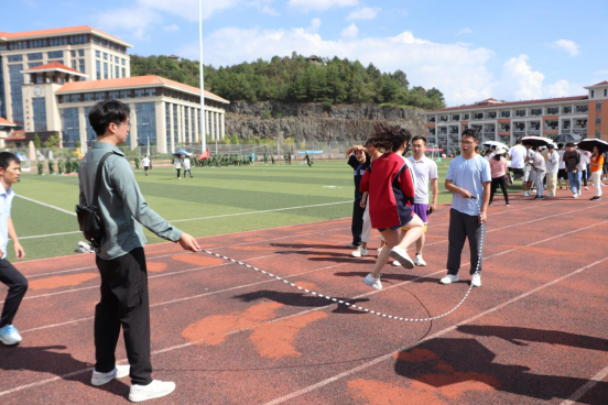运动会设置了多个趣味横生的项目,包括拔河比赛、集体跳长绳、个人跳绳、五人六足、双手正面垫气排球、呼啦圈,既检验了教职工的身体素质,又融入了趣味性和团队协作的元素。
